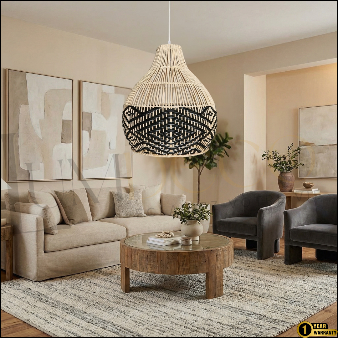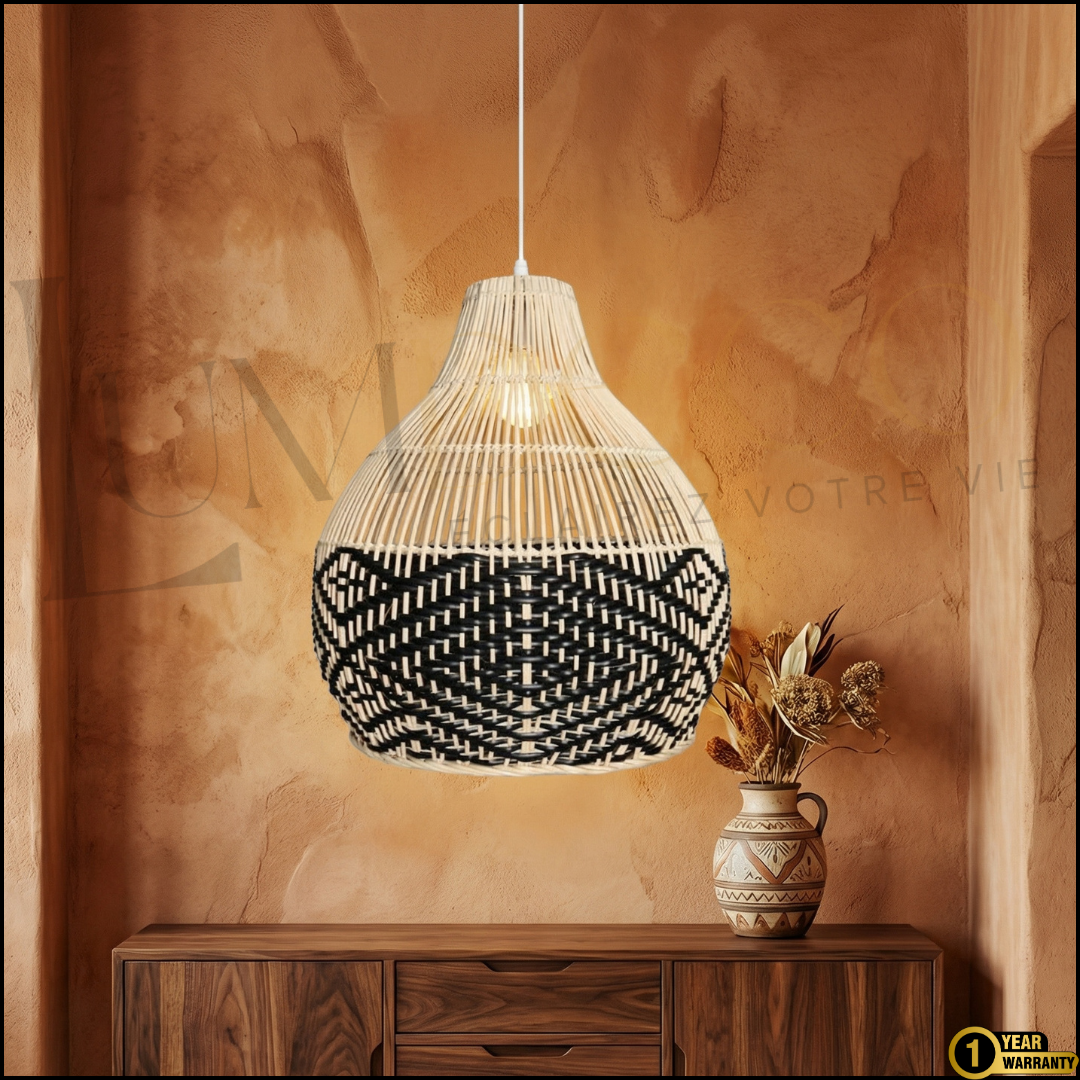 La suspension BALINI séduit par son tressage naturel contrasté, mêlant beige et noir pour créer un motif graphique subtil et élégant.