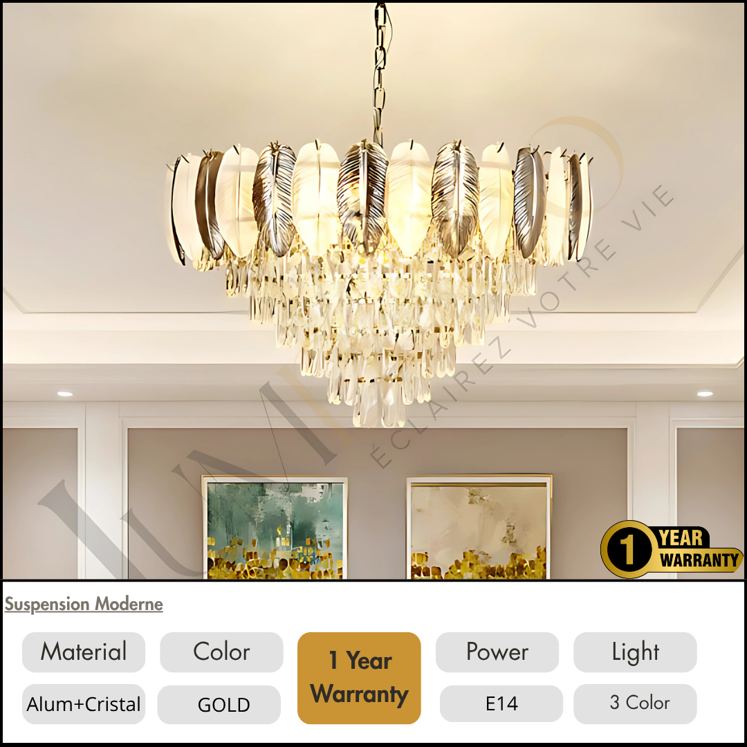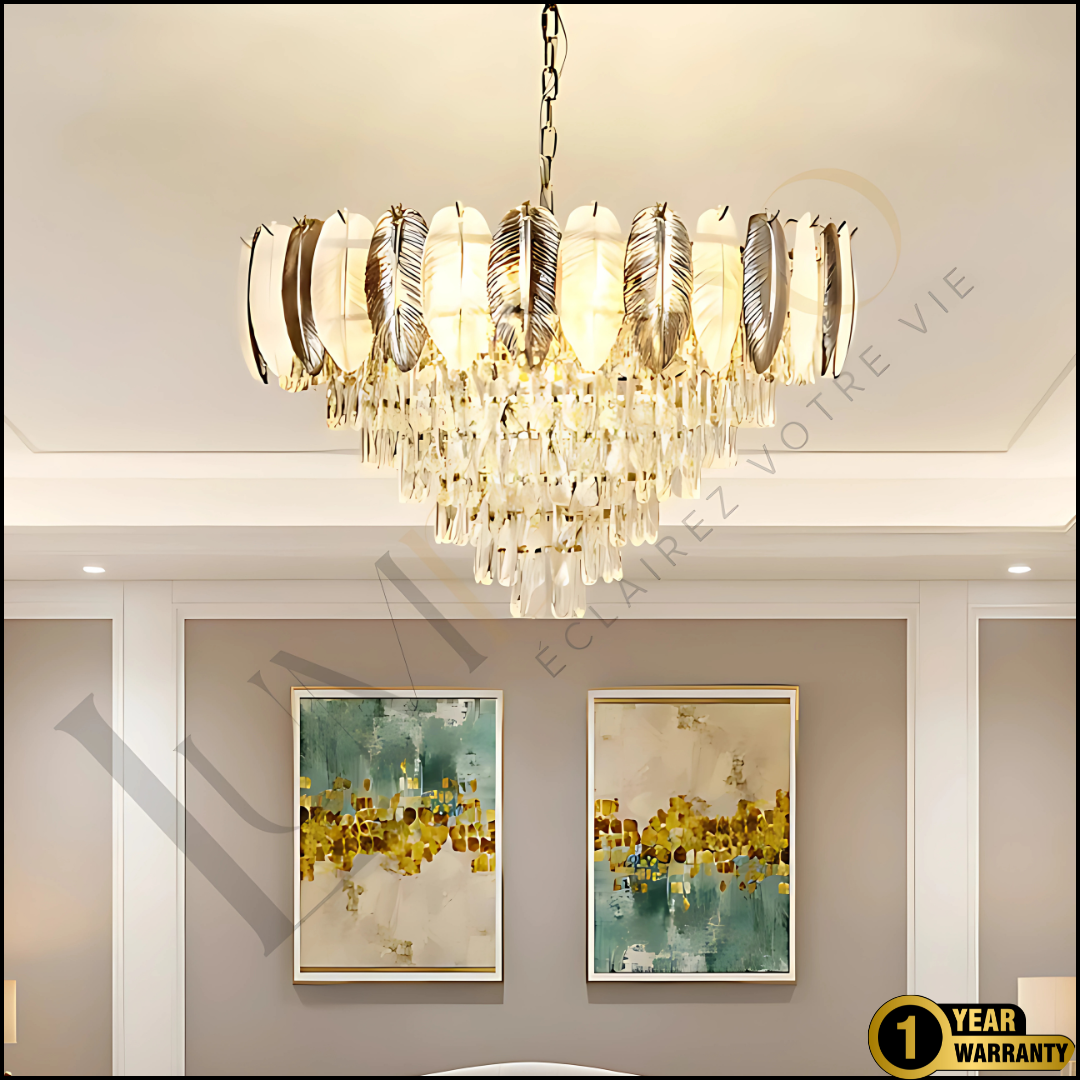 Chaque plume stylisée en finition gris métallisé reflète subtilement la lumière, tandis que les cristaux suspendus captent et diffusent les reflets avec un effet étincelant. Ce lustre devient ainsi un véritable centre d’attraction, idéal pour sublimer une pièce avec élégance.