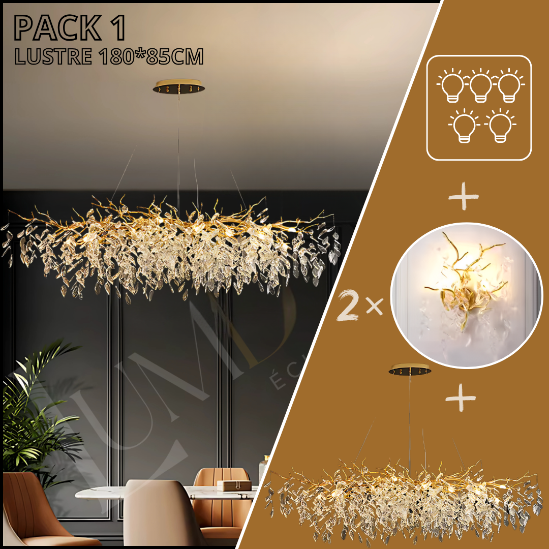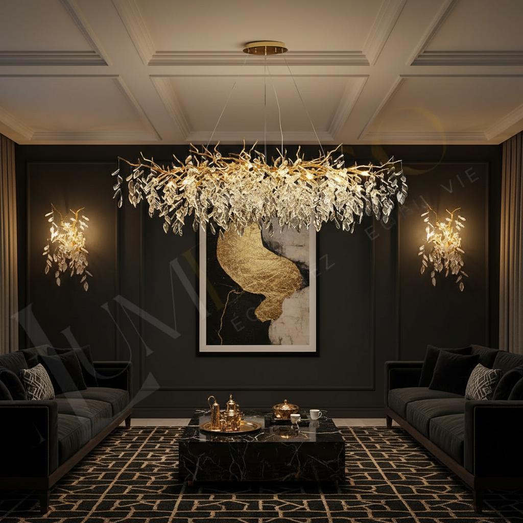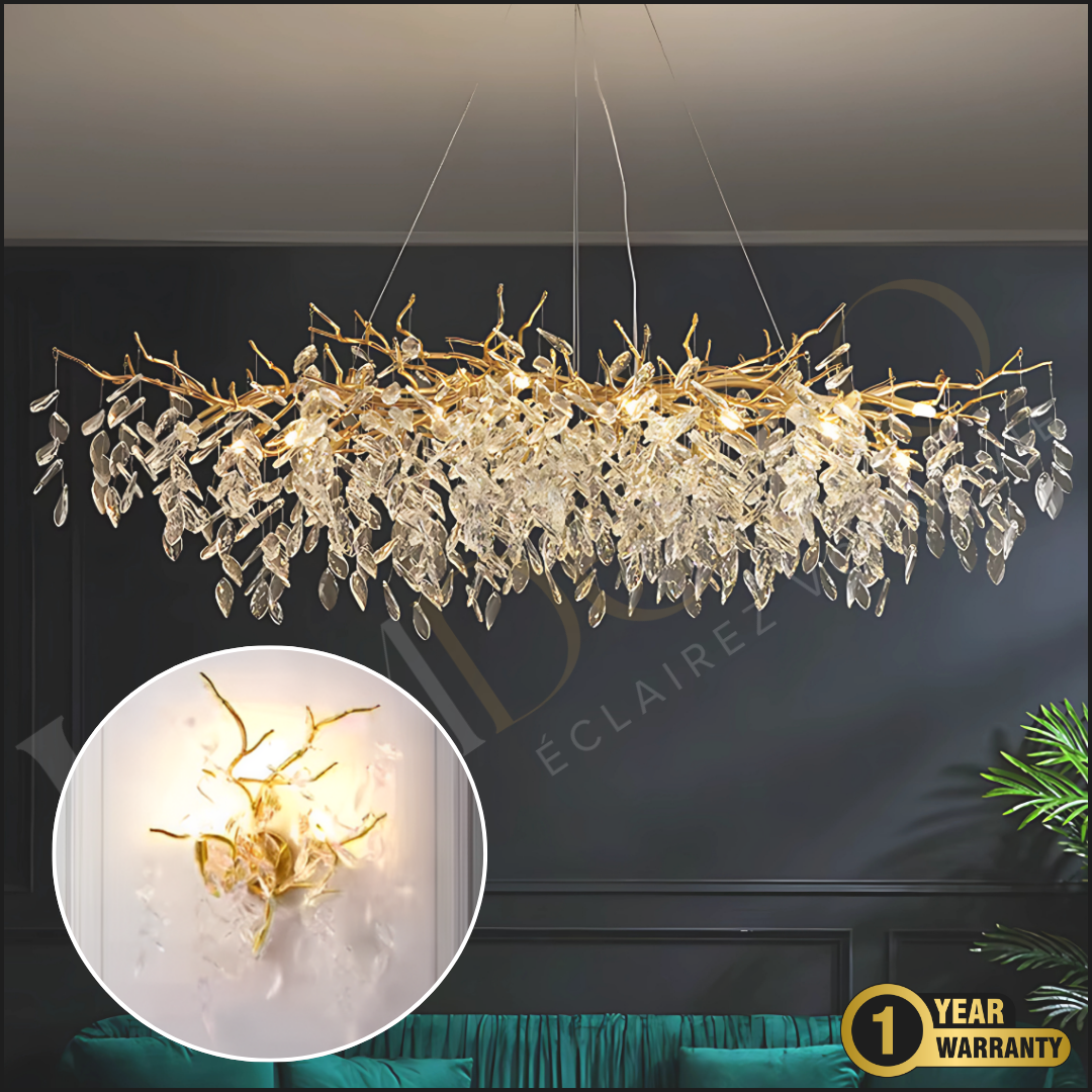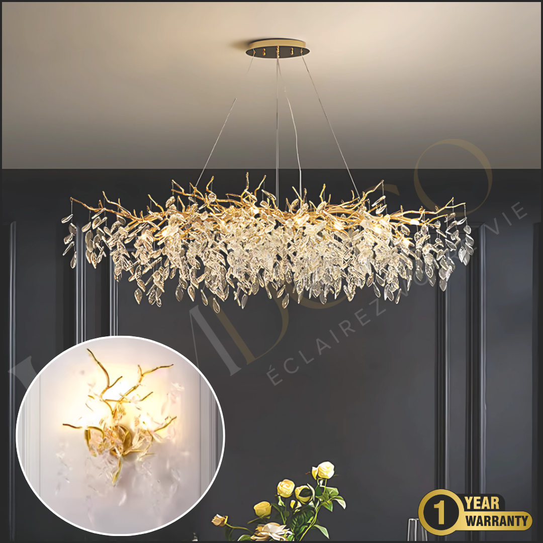 Avec sa forme ovale élégante et sa structure dorée sublimée de pampilles cristallines en forme de feuilles, le lustre diffuse une lumière scintillante et chaleureuse. Disponible en plusieurs dimensions (100×50 cm, 120×60 cm, 150×75 cm, 180×85 cm), il s’adapte aussi bien aux salons spacieux qu’aux salles à manger contemporaines.