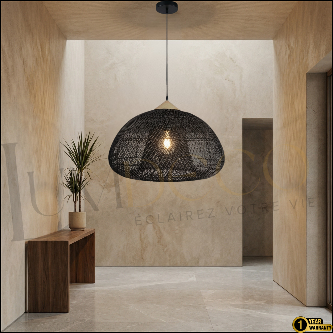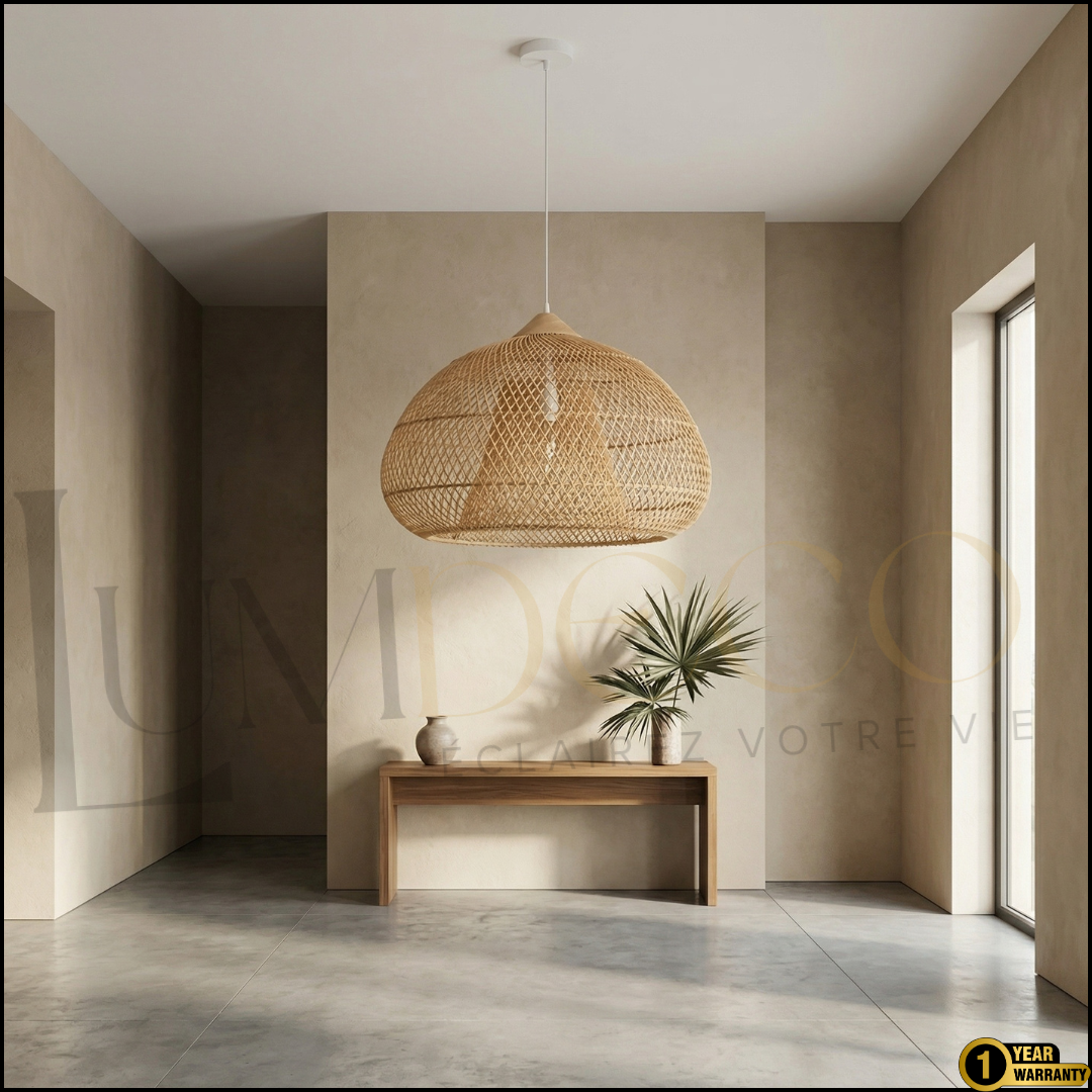 Son tressage finement travaillé crée un jeu d’ombres subtil qui enrichit l’ambiance.