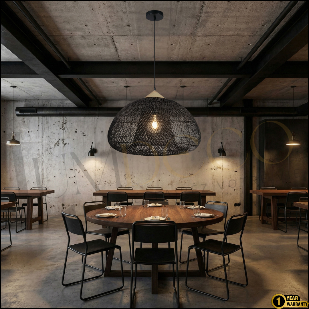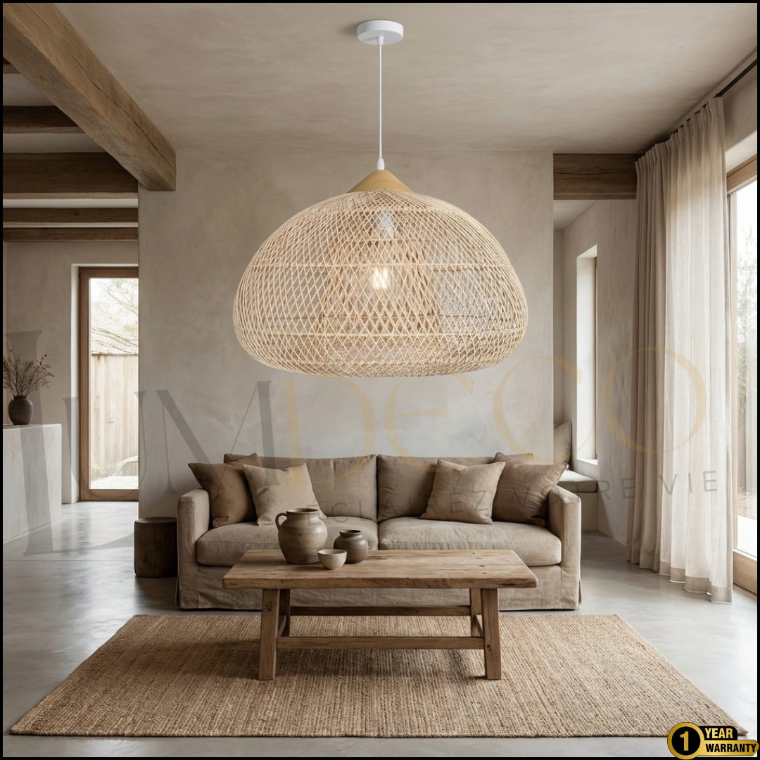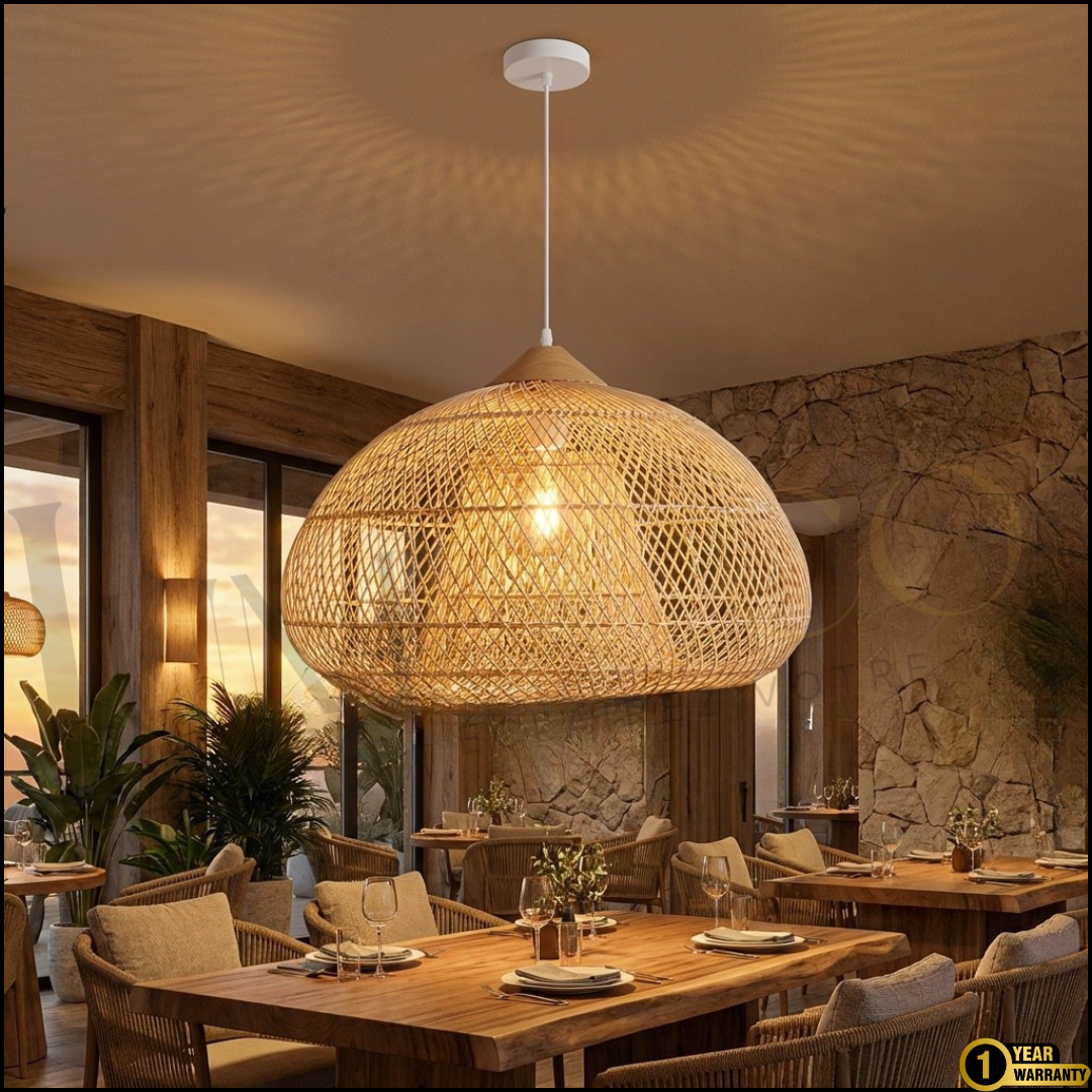 Sa forme diffuse une lumière douce et enveloppante, idéale au-dessus d’une table ou dans un salon cosy.