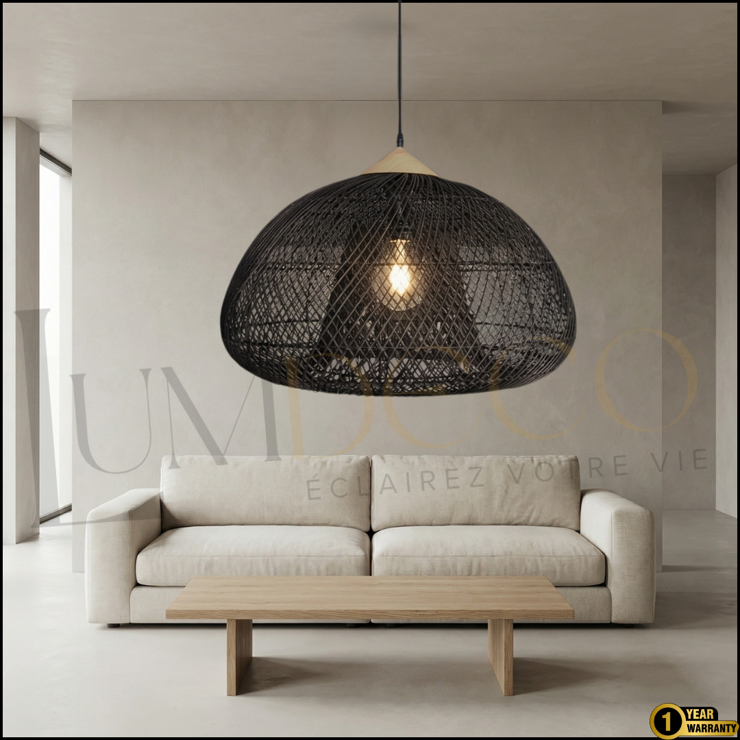 La suspension MARIO séduit par sa forme généreuse et son tressage ajouré qui diffuse une lumière douce et chaleureuse.