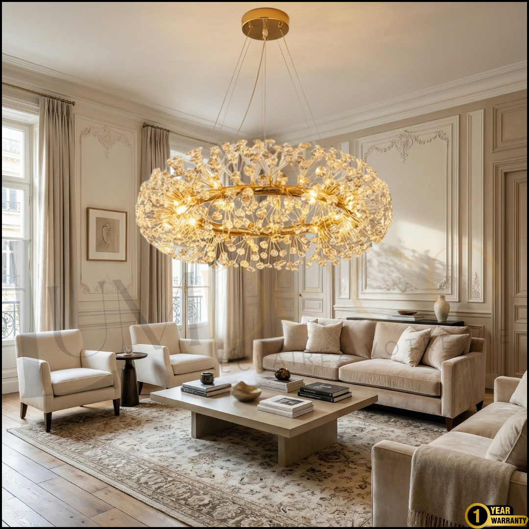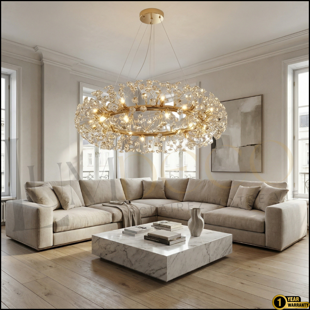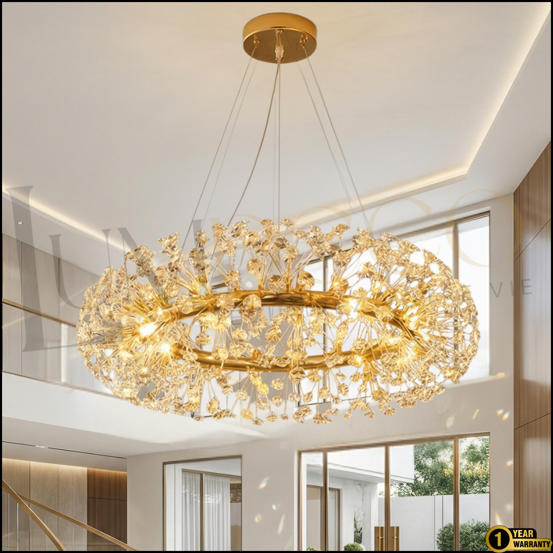 VALENCIA se distingue par sa structure dorée sophistiquée entourée d’un délicat ensemble de cristaux lumineux.
