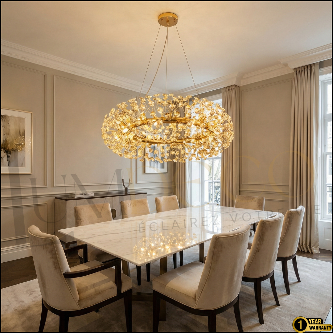 La Suspension VALENCIA incarne le raffinement contemporain avec son design circulaire orné de cristaux scintillants.