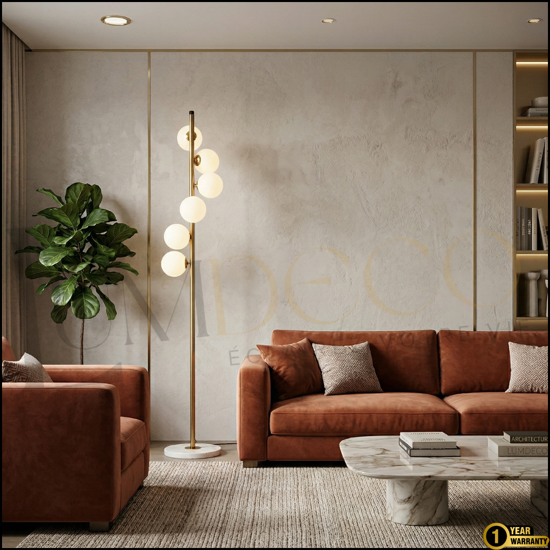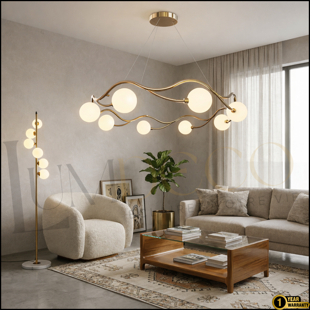 Avec ses bras métalliques ondulés et ses globes lumineux en verre opalin, ONDA diffuse une lumière douce et chaleureuse qui transforme immédiatement l’atmosphère de la pièce.