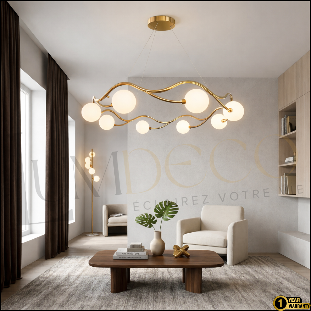La finition dorée associée aux globes lumineux crée un contraste élégant et raffiné.