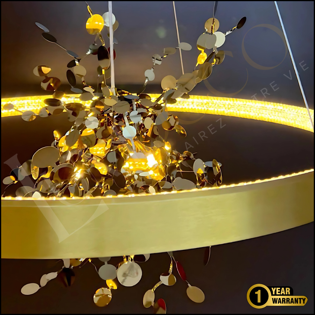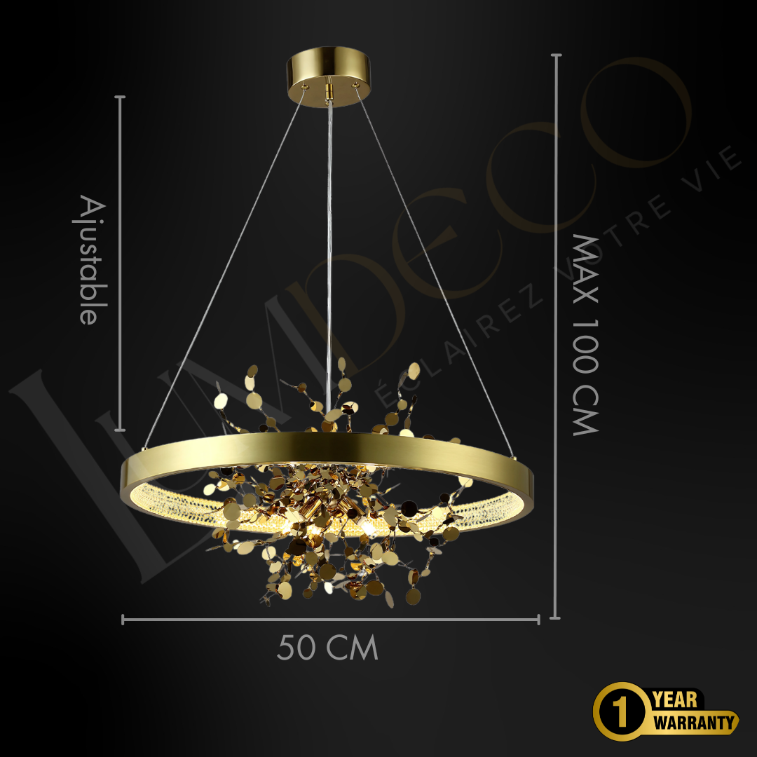 Le lustre AURELIA allie design contemporain et touches florales artistiques. Sa couronne circulaire dorée suspendue accueille une pluie délicate de feuilles métalliques qui donnent une impression de mouvement suspendu. Un véritable bijou lumineux pour tout intérieur moderne.