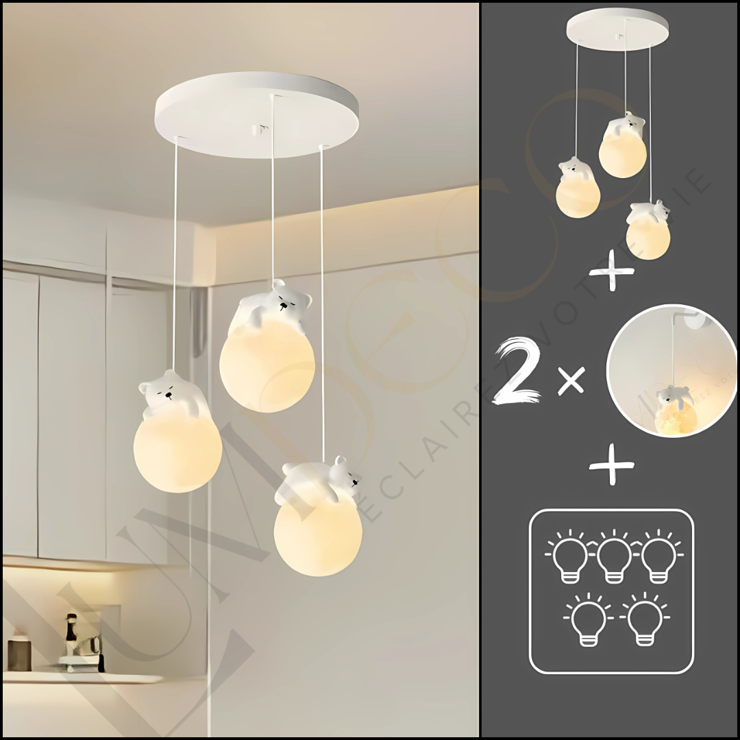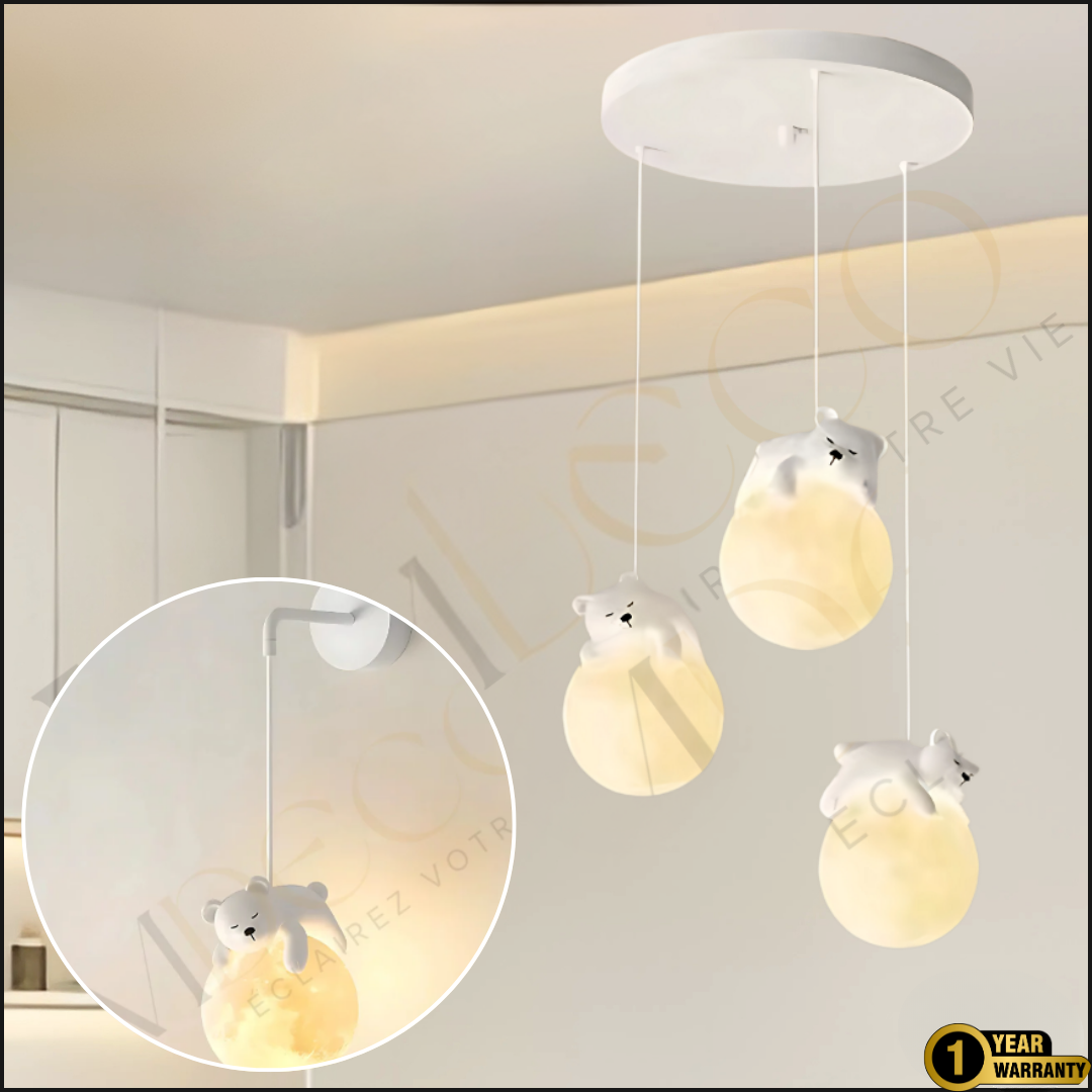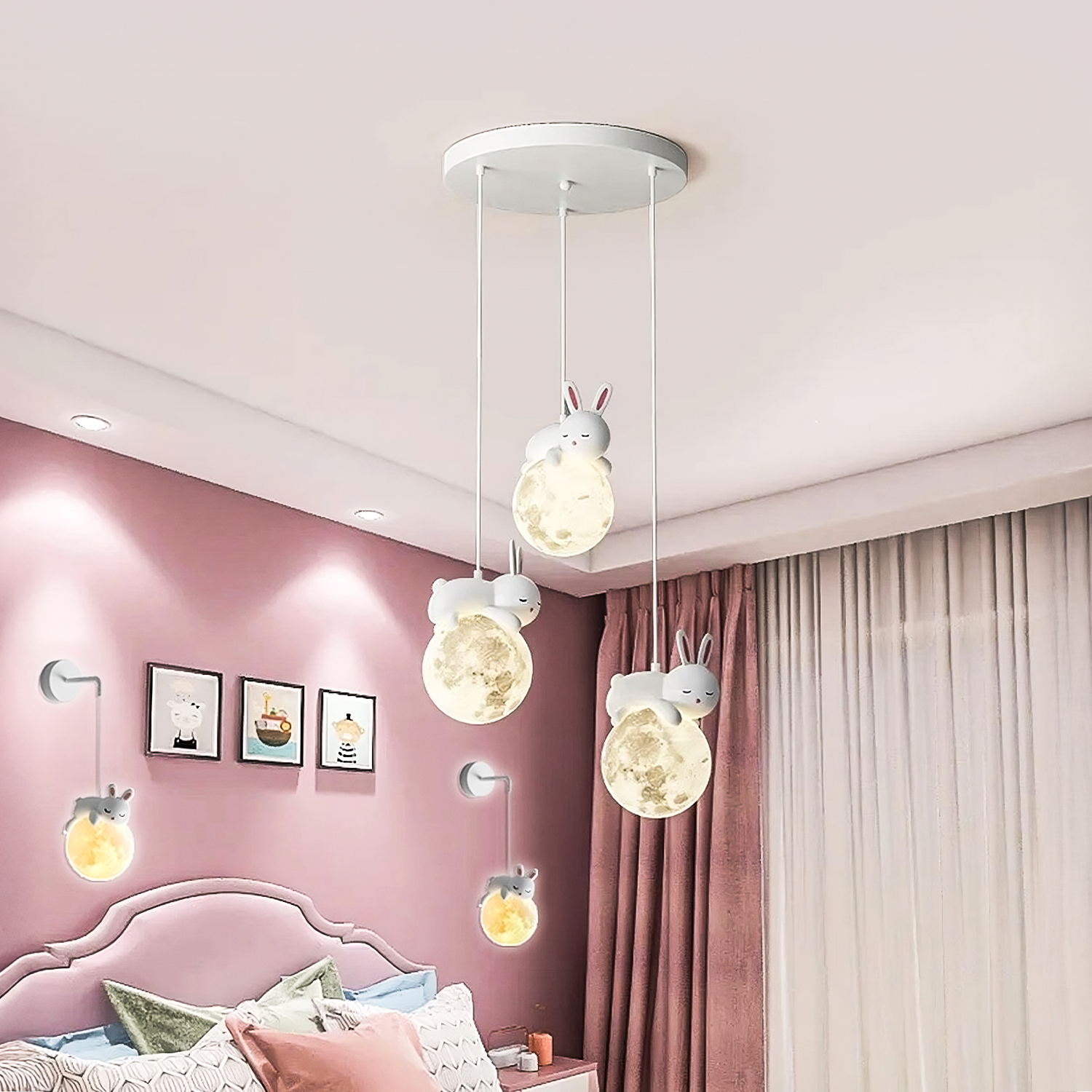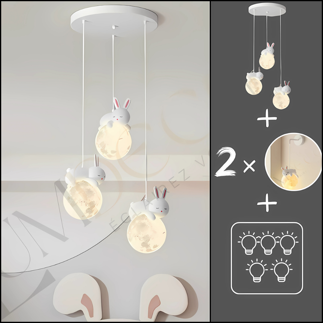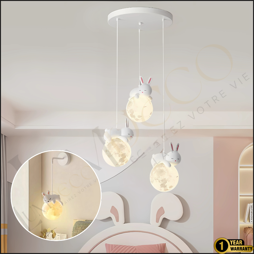 1 Suspension LUNALAPIN avec ses adorables lapins perchés sur des lunes lumineuses.