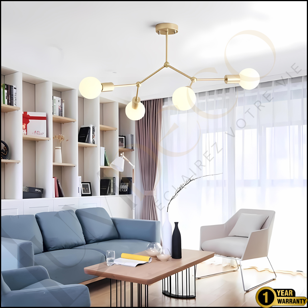 Apportez une touche contemporaine à votre intérieur avec la suspension LUMISPHÈRE, un plafonnier au design minimaliste et élégant. Composée de 4 sphères lumineuses montées sur une structure dorée aux lignes épurées, elle s’intègre parfaitement dans un salon, une salle à manger ou un bureau au style moderne.