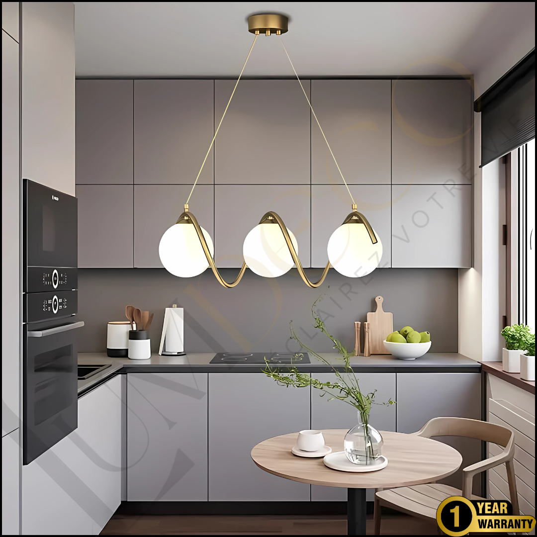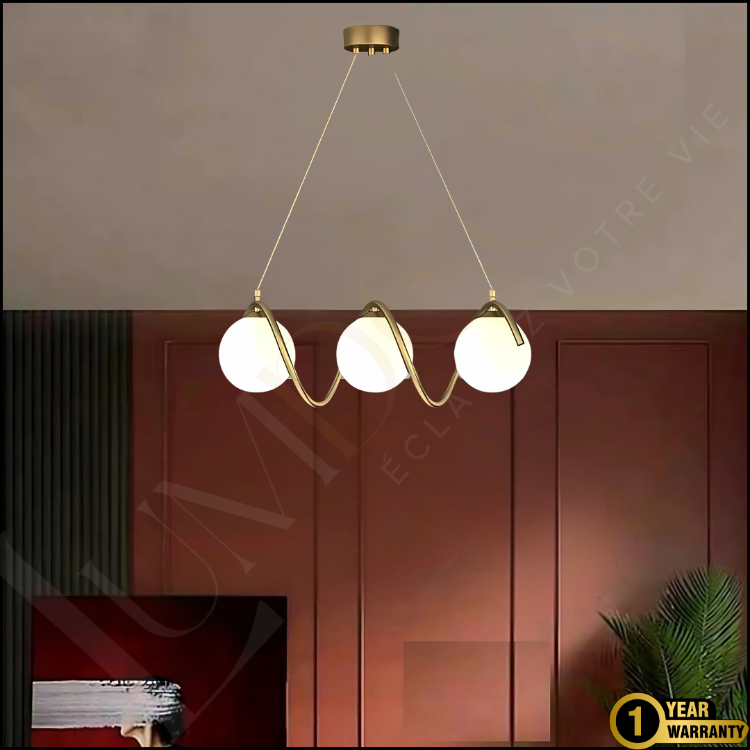 Sublimez votre intérieur avec la suspension VELINA, une pièce au design raffiné et sculptural. Composée d’une structure en métal doré formant une vague élégante, cette suspension se distingue par ses trois globes en verre dépoli qui diffusent une lumière douce et homogène. Chaque détail a été pensé pour apporter modernité, chaleur et sophistication à vos espaces de vie.