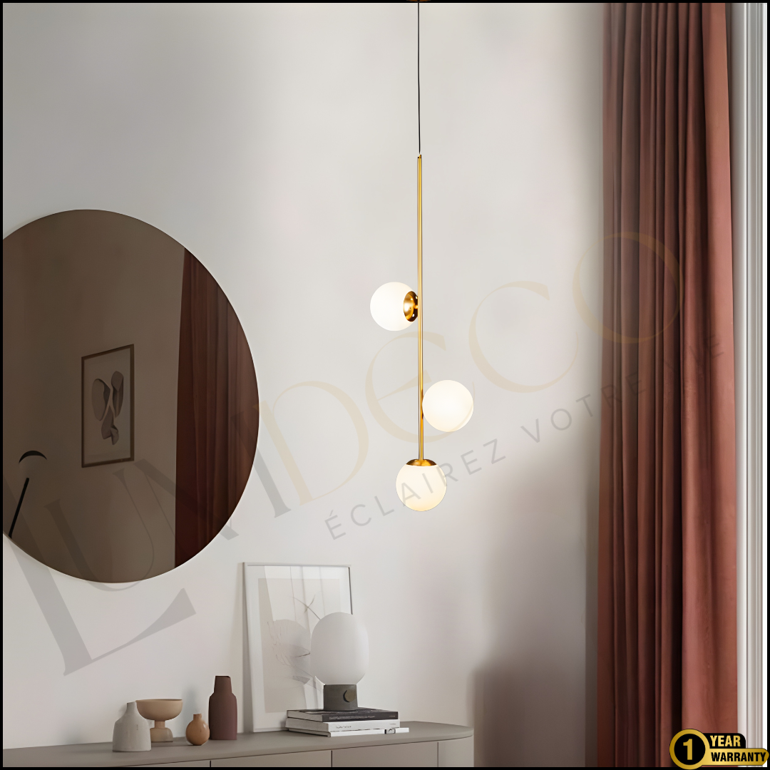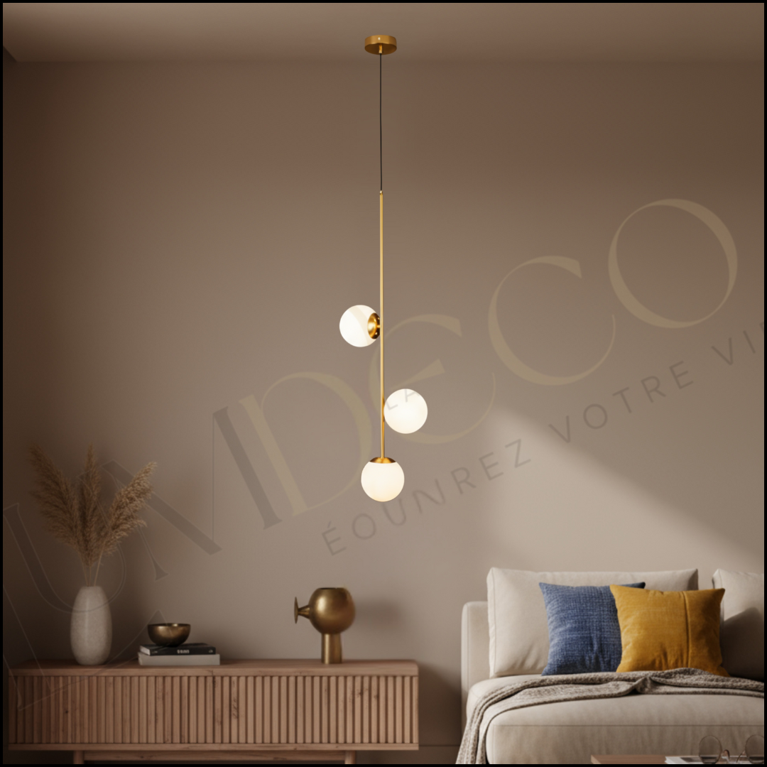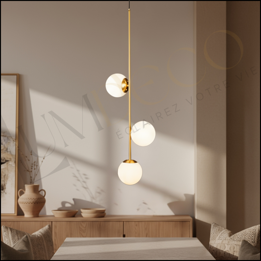 La Suspension TRILUNA incarne l’harmonie entre design contemporain et lumière apaisante. Avec sa tige dorée raffinée et ses trois globes en verre opalin, elle apporte une touche de sophistication à tout espace — chambre, salon ou salle à manger.