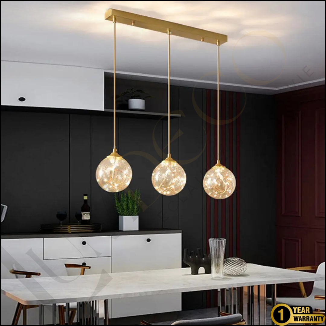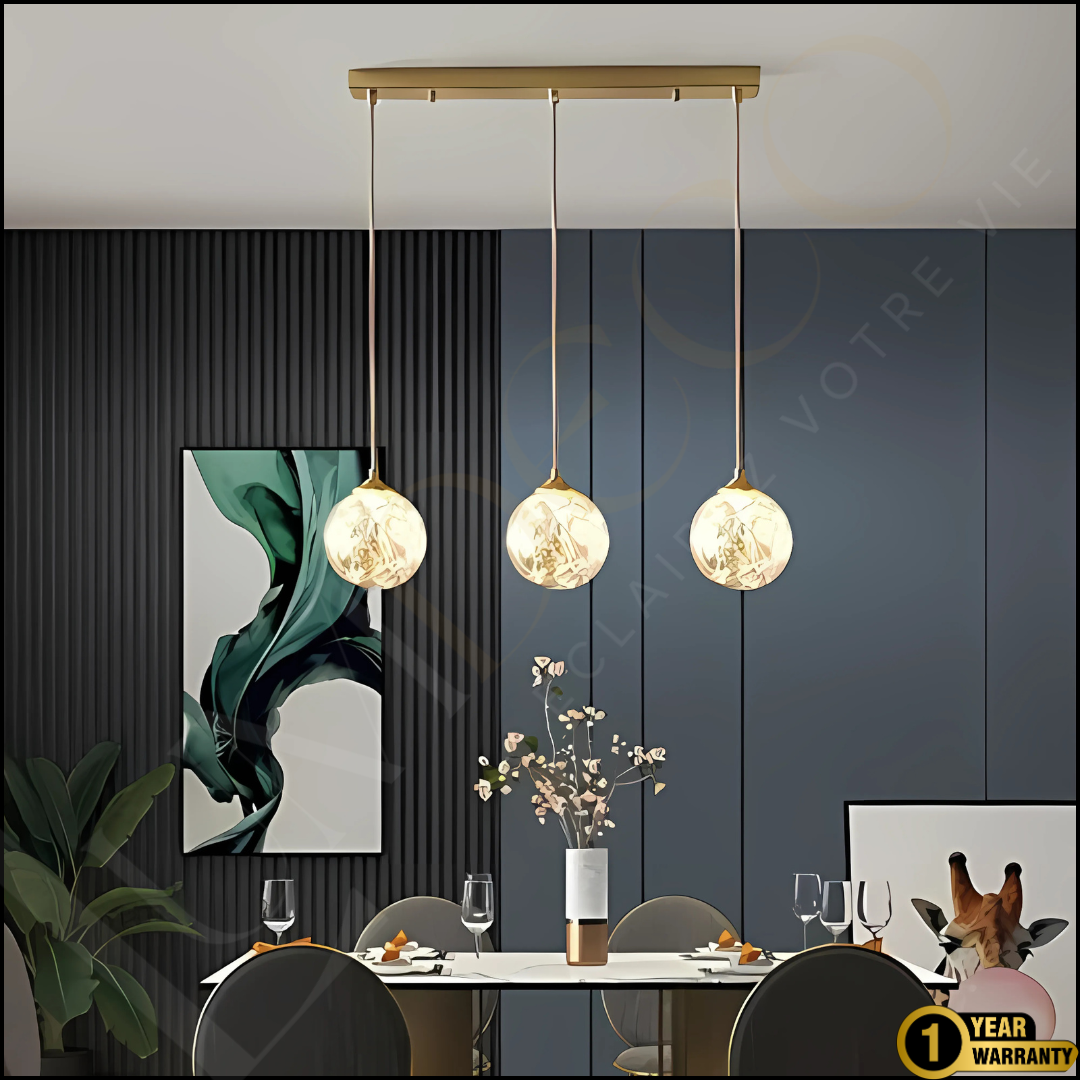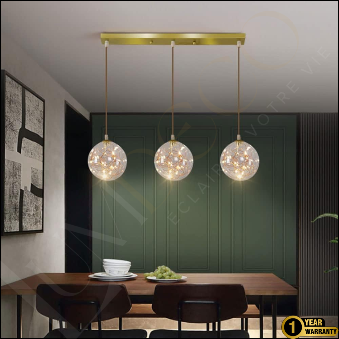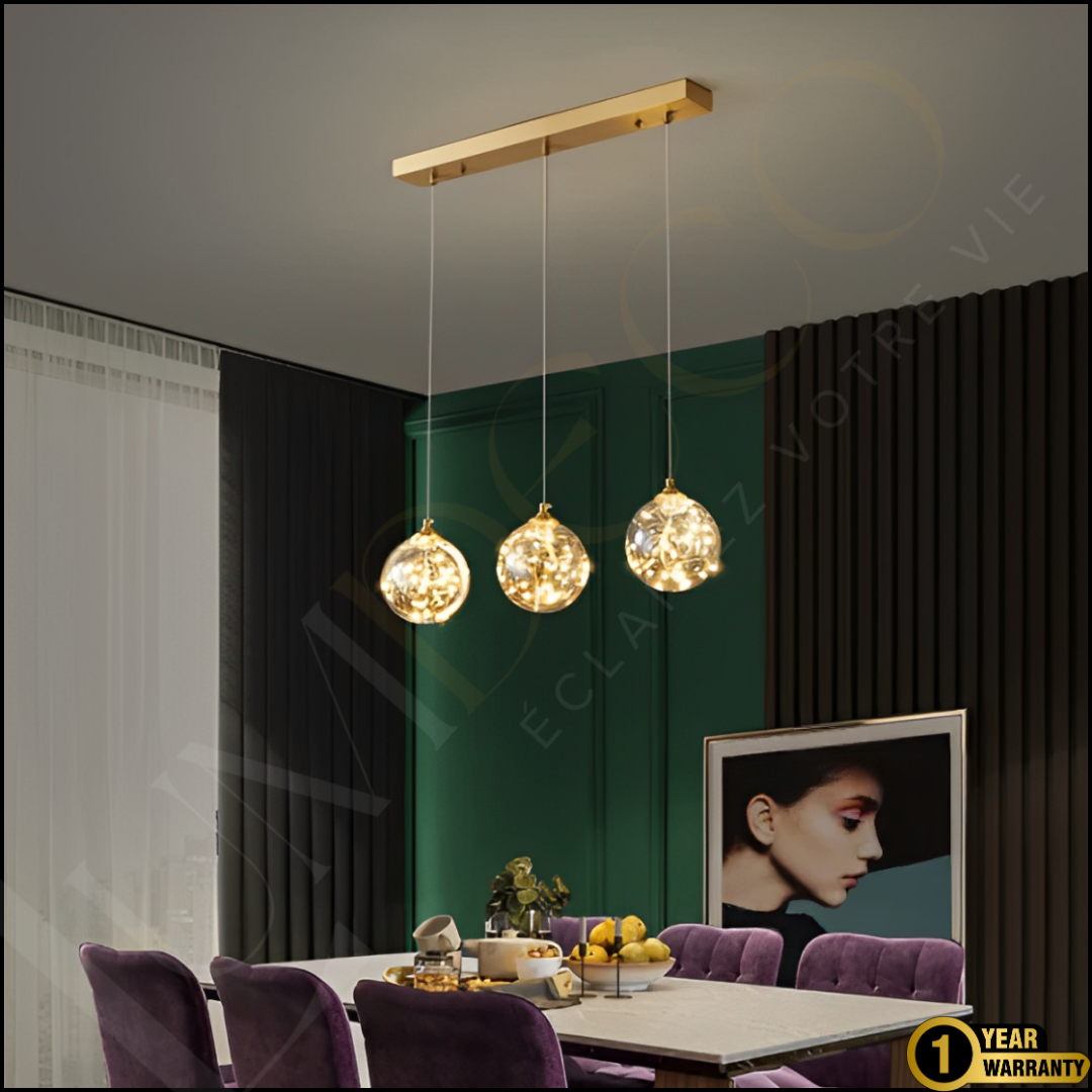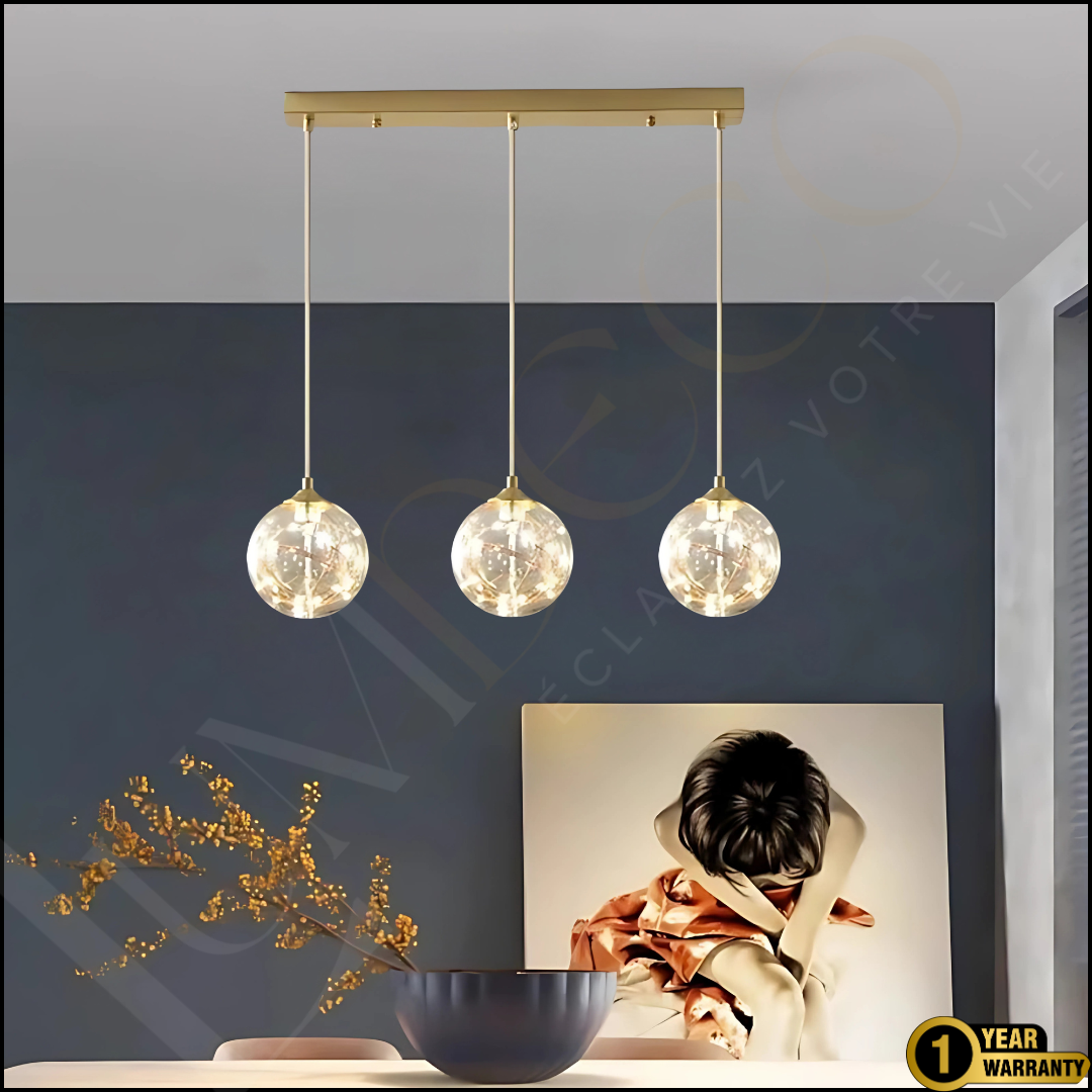 La SANDIA séduit par sa structure dorée rectangulaire et ses trois boules en verre transparent ornées de délicats fils lumineux. Son allure contemporaine s’adapte parfaitement à une salle à manger, un salon ou même un espace professionnel chic.