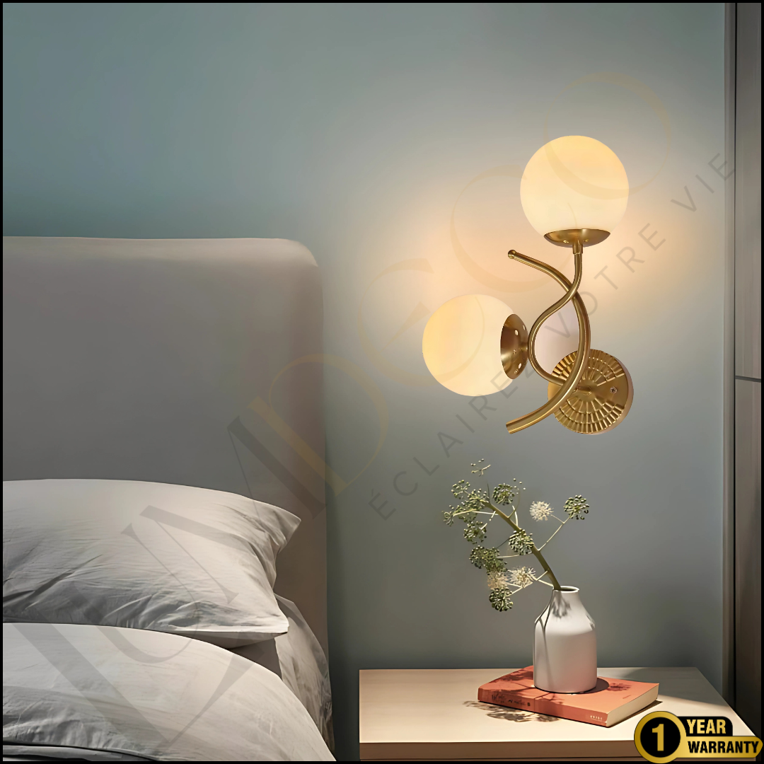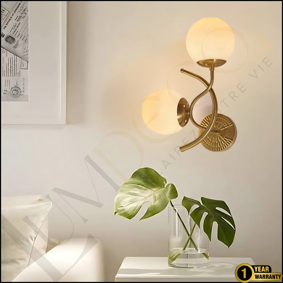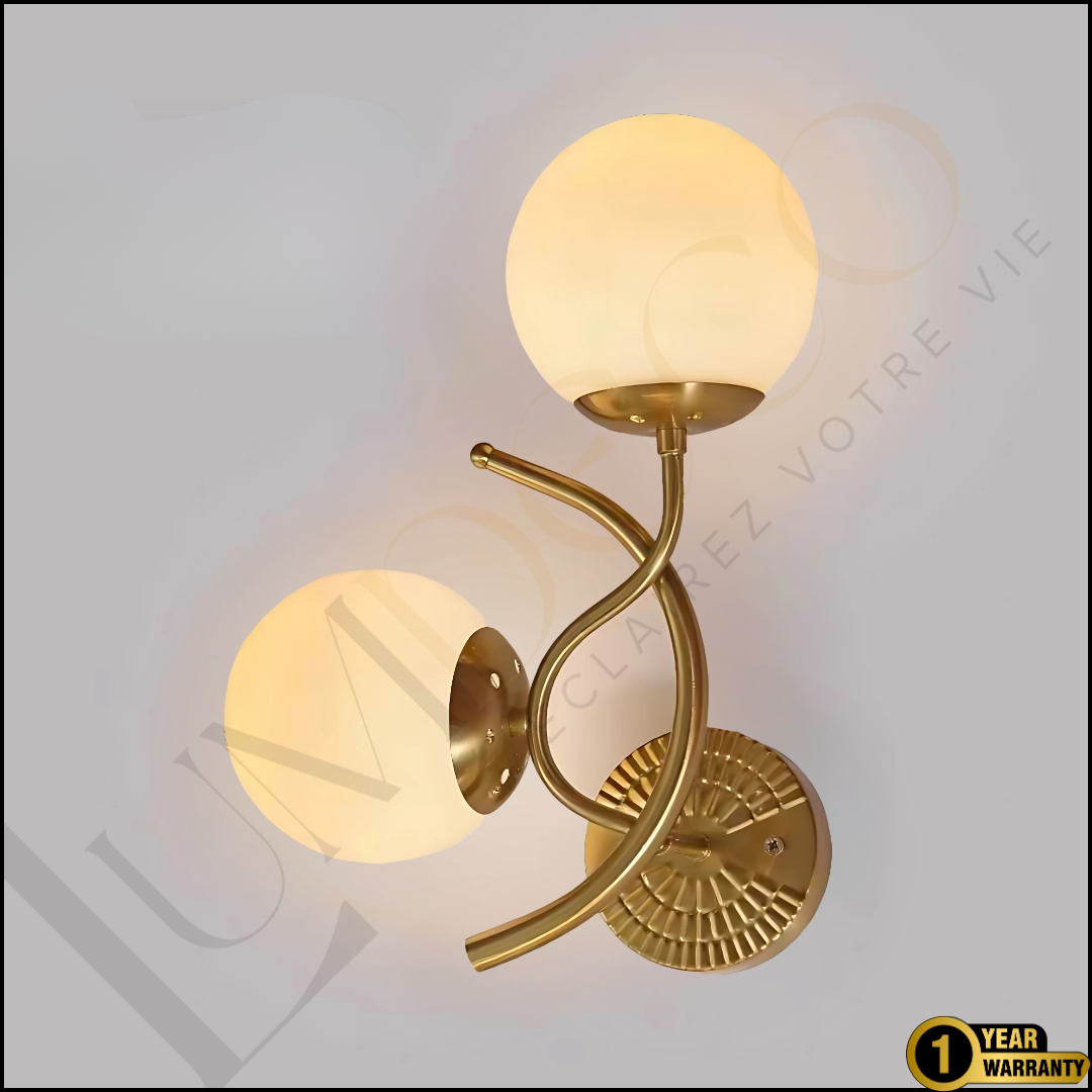 Apportez une touche raffinée et moderne à vos murs avec l’applique CLARIS. Ses deux globes blancs opalins diffusent une lumière douce et homogène, soutenus par une structure dorée aux courbes élégantes. Une pièce qui allie simplicité et sophistication pour sublimer vos espaces.